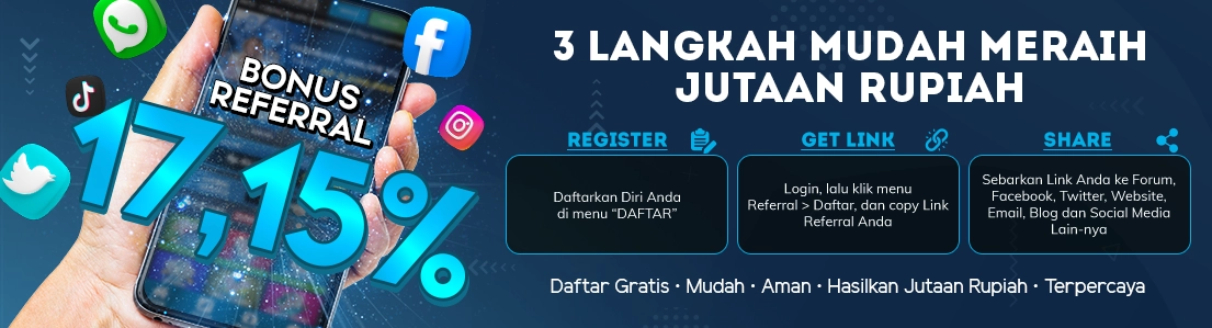 Referral system tidak dipungut biaya apapun. Hanya dengan modal online saja setelah itu Anda hanya tinggal mengecek keuntungan Anda yang dapat dilihat secara online kapanpun dan dimanapun. Register sekarang juga dan referensikan Link Referral Anda